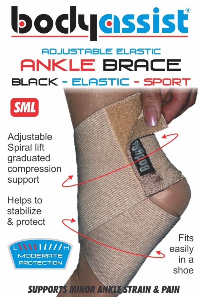 The Bodyassist Adjustable Elastic Ankle Brace has an adjustable side closure which allows for a better fit before and after swelling reduces. It features adjustable spiral lift graduated compression support and helps to stabilise and protect the ankle joint and associated soft tissue. It fits easily into a shoe and is suitable for low level strains and/or sprains.