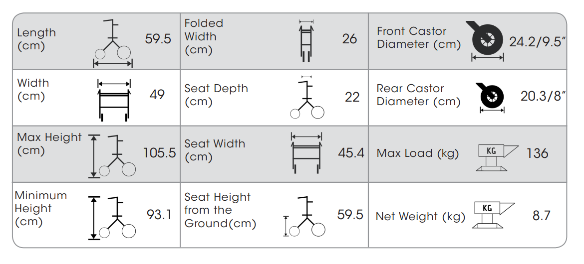Tool free height adjustable and brake adjustment kit, foldable water proof seat, easy installable Nylon bag.