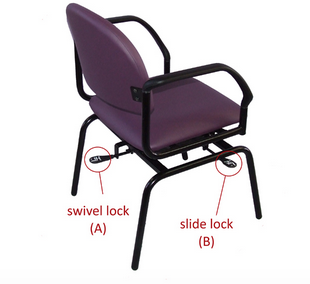 Lift the slide lever (B) to move the seat forward. Release the lever and the seat will lock in the first position. To move closer to the table, lift the lever, slide forward to the second position, then release the lever again.