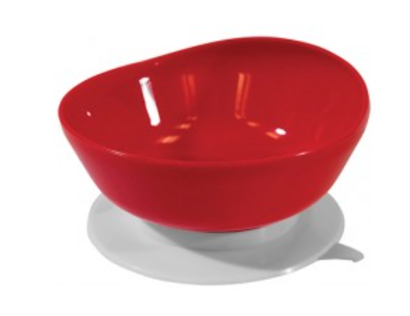 This large bowl features a scoop side that accommodates individuals who have difficulty when eating, particularly with one hand. It has a non-slip suction cup to keep the bowl in place. Red bowl assists those visually impaired.